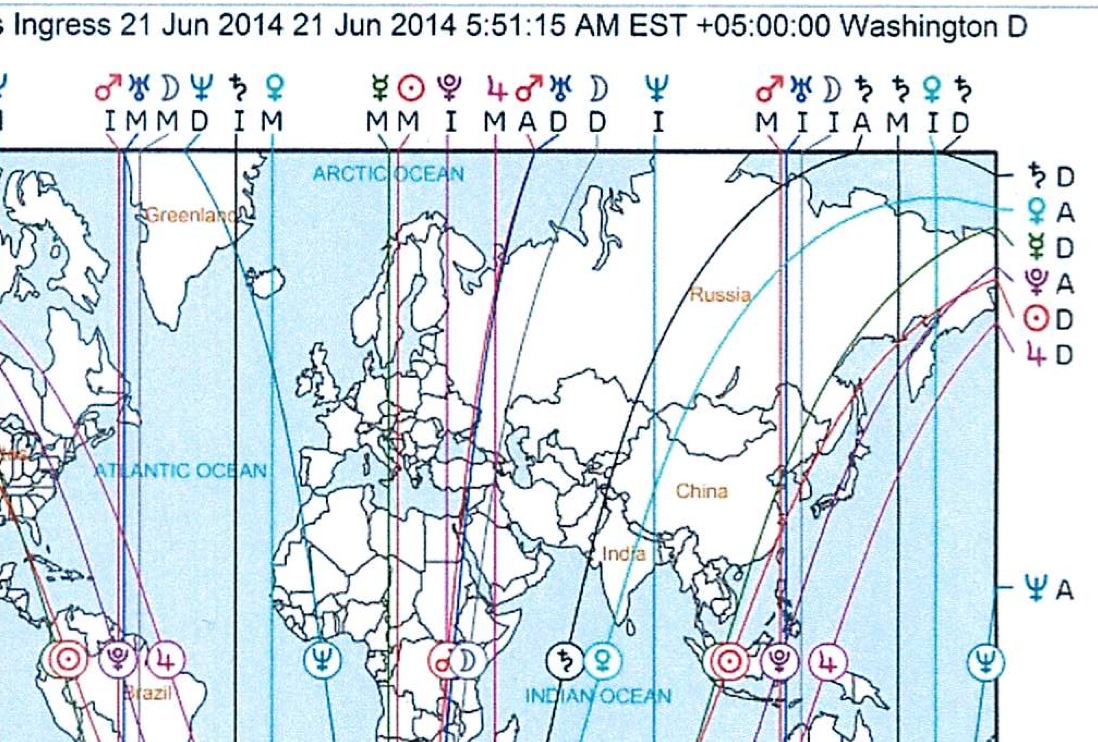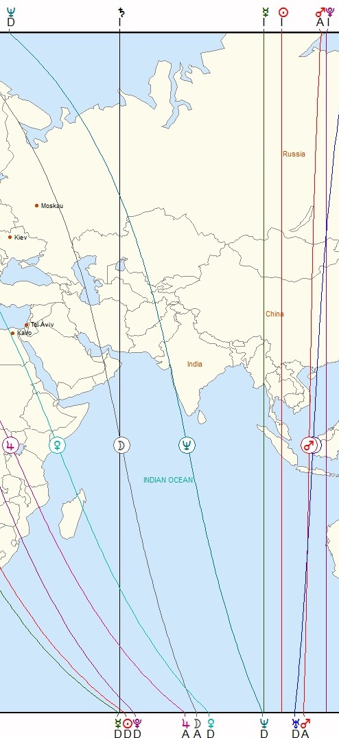 Wie man somit klar ersichtlich, daß es möglich ist, mit dieser Art der Horoskopdarstellung, etwaige Problemzonen unseres Planeten mit Hilfe der Mundan-Astrologie, hier Astrogeographie (*ACG*, Astro-Cart-Graphie), übersichtlich dazustellen, und somit im Voraus das kommen Geschehen, auf der Karte, zu überblicken.