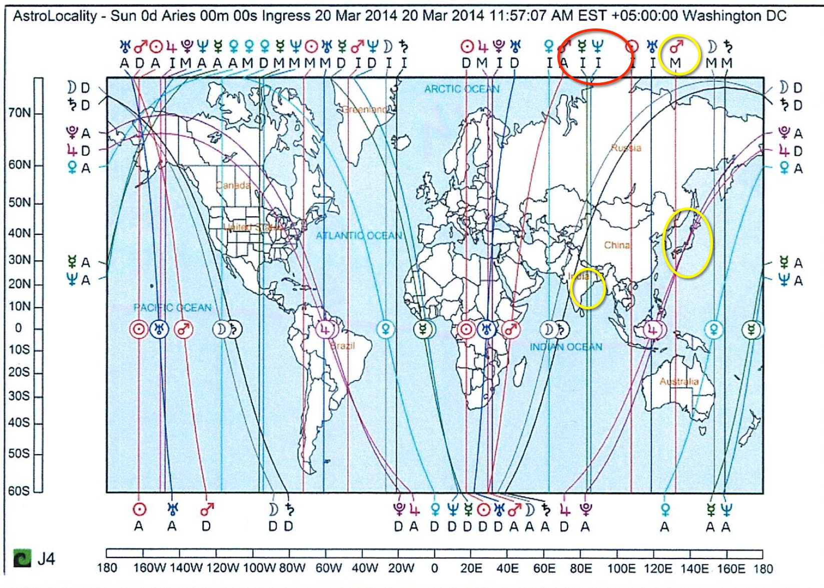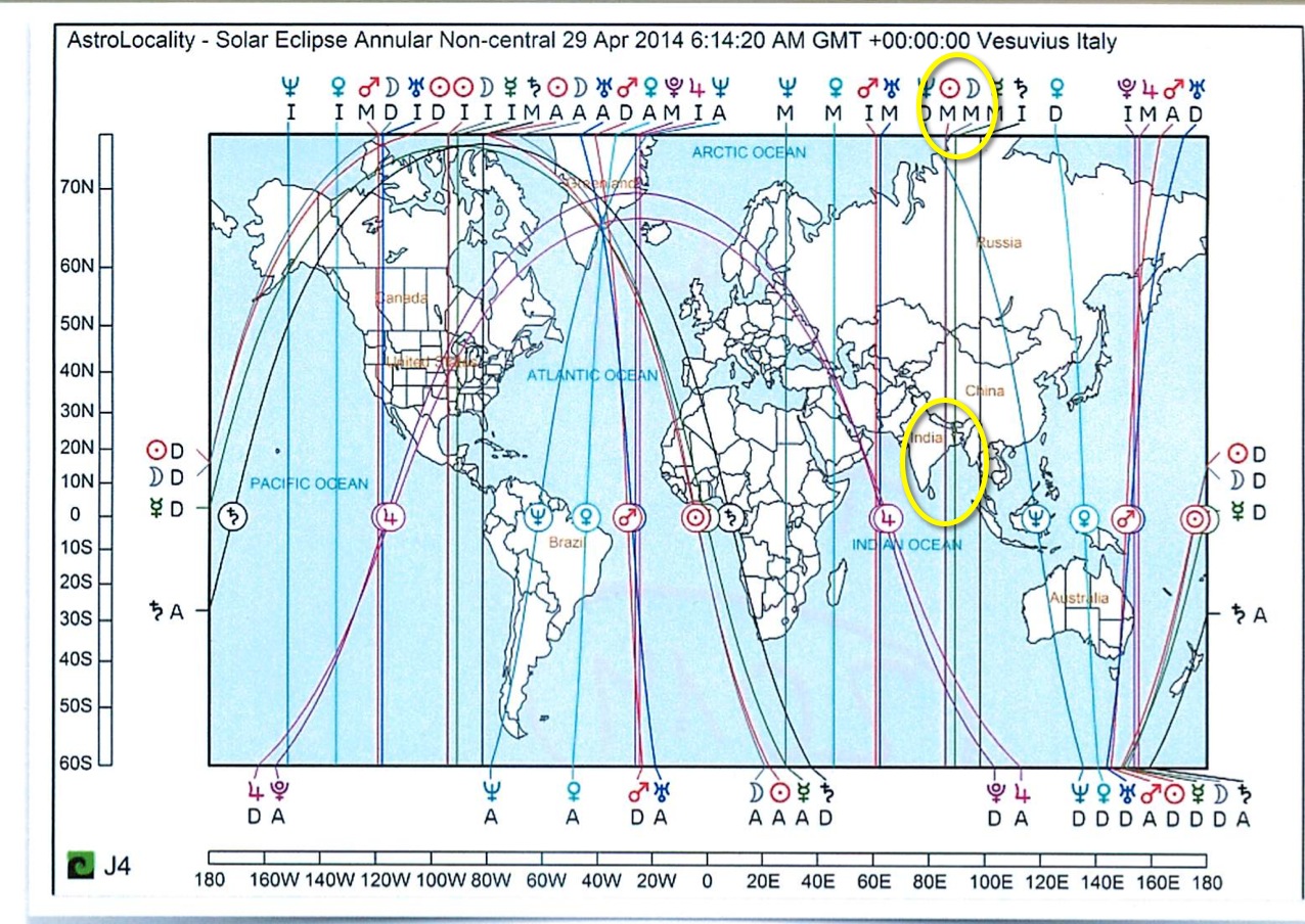 Nun die Übersicht in der geographischen Karte in  astrologischer Weise  mit *ACG* -Karte von Ingressen,  bez. Lunar (Voll oder Neumond) sowie Finsternissen die im Zusammenhang mit den  Ereignisse stehen.