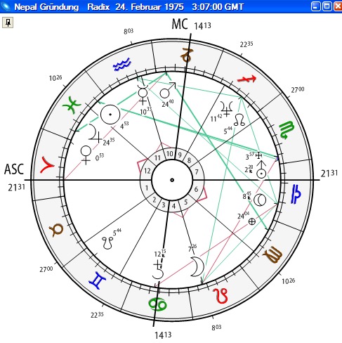 Wie man am direkt erstellten Horoskop auf die Hauptstadt Katmandu von Nepal erkennen kann, ist Saturn ganz nahe am MC. Pluto und Uranus sind (30er Teilung) im selben Grad und noch dazu im kardinalem oder beweglichen Zeichen! Der 15 te Grad kardinal wäre noch dazu, besonders in der Betrachtung v. Alfred Witte, stark, weil er im Zusammenhang mit der Erdachse steht (0° Widder), hier in einem sogenannten harten Winkel bez. Aspekt!