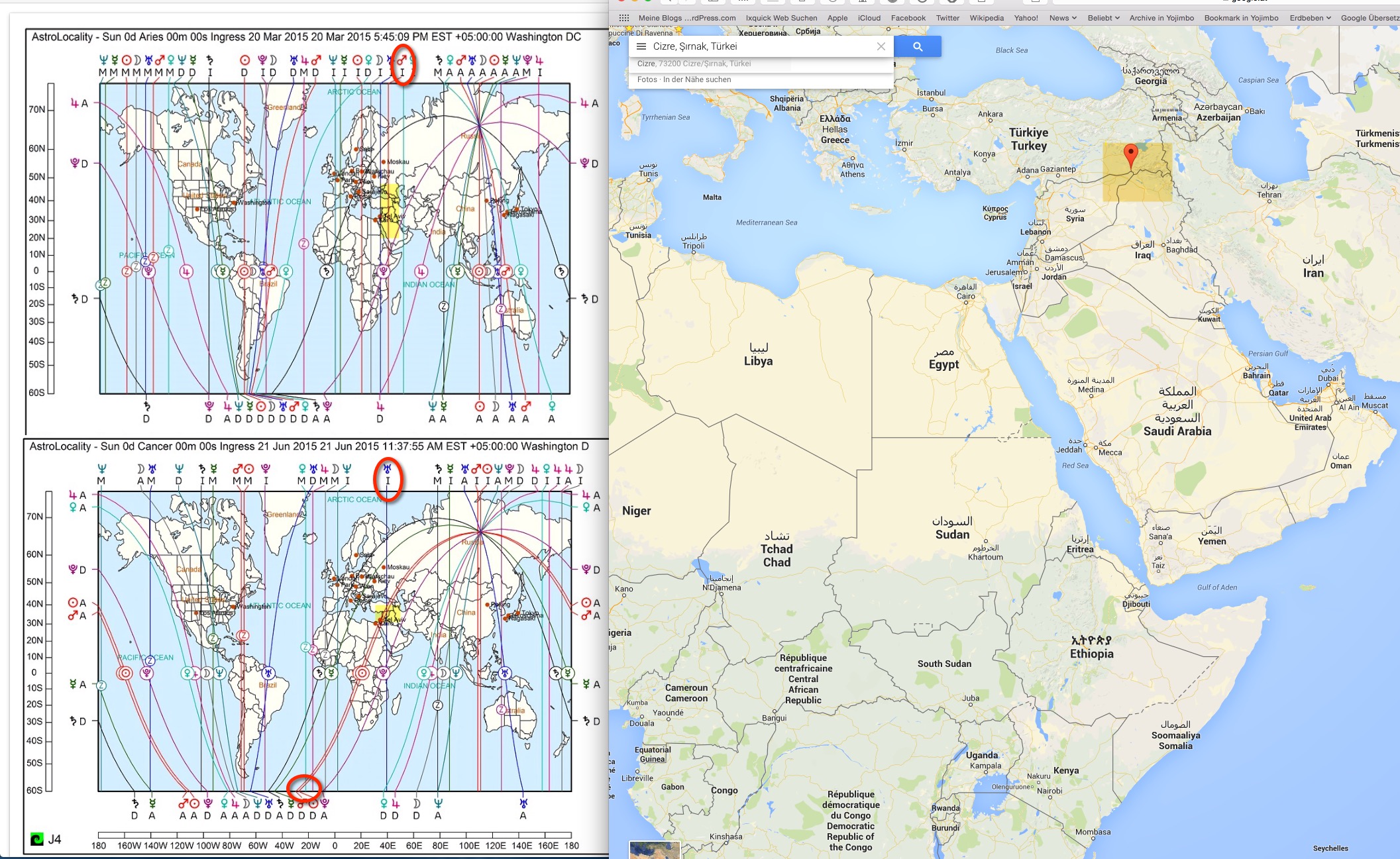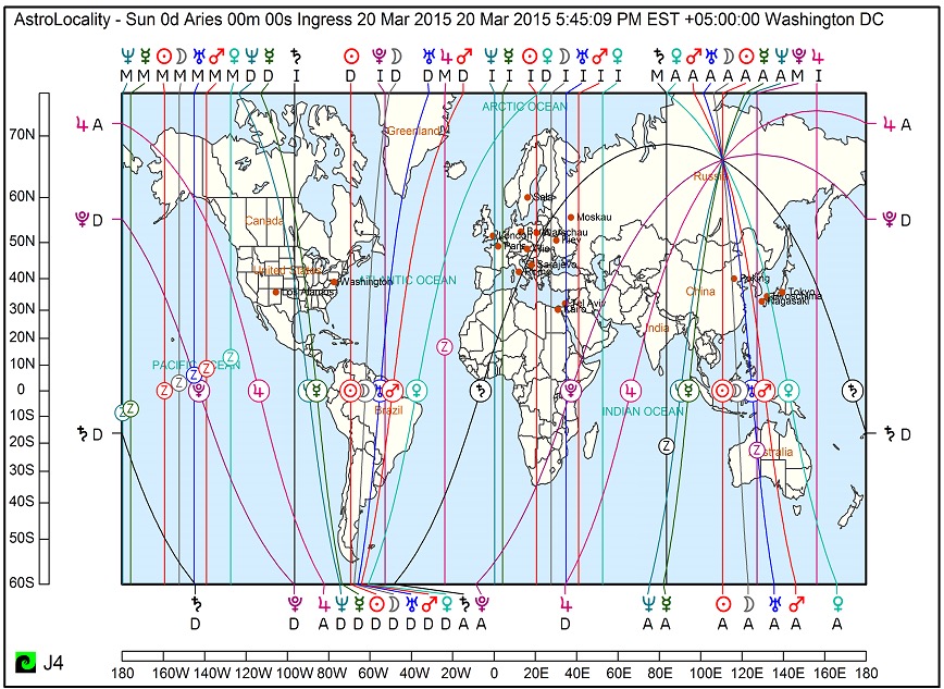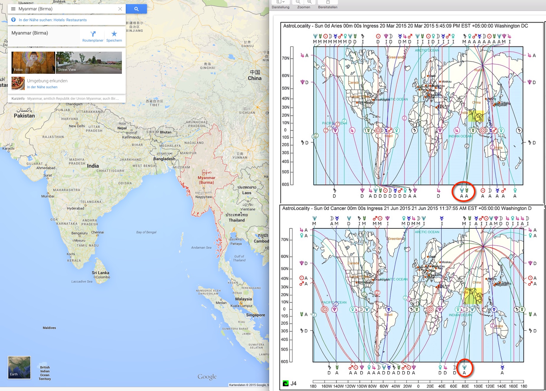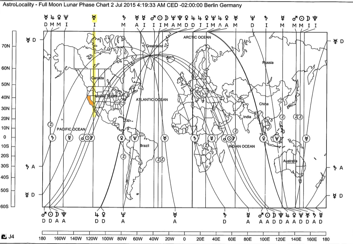 Wir sehen hier die Mars-MC-Linie auf Kalifornien und gleichzeitig steht der Saturn am Deszendent. Saturn steht auch für Entbehrung und Einschränkung und Mars für Feuer. Das ist für ein Jahr gültig. Für eine zeitliche Auslösung in diesem Jahr ist die Sonnenfinsternis, die in diesem Zeitraum fällt, und eines der Mondhoroskope, hier Vollmond, quasi behilflich. Sie zeigen hier wiederum den räumlichen Bereich von Kalifornien als „Problemzone“!