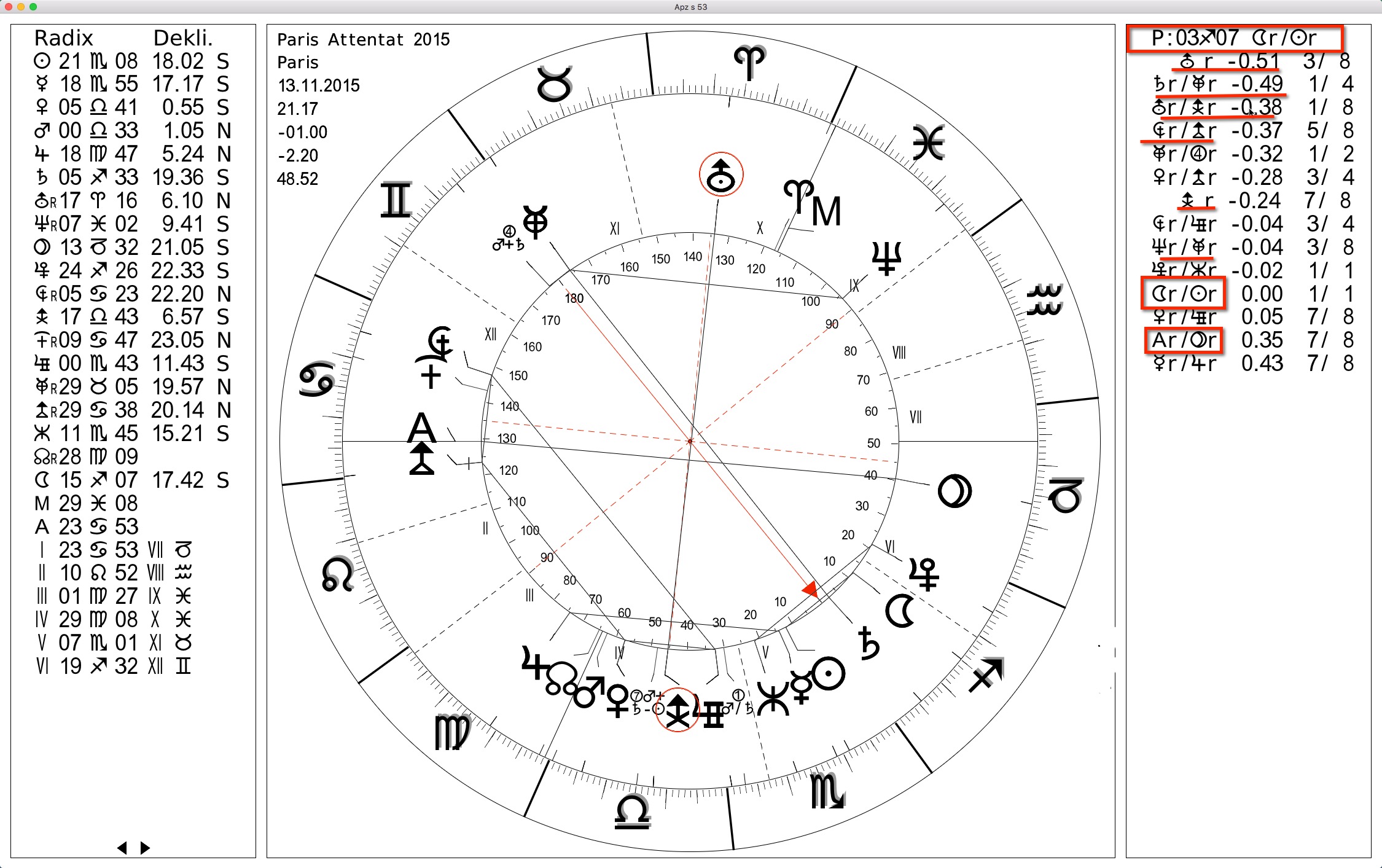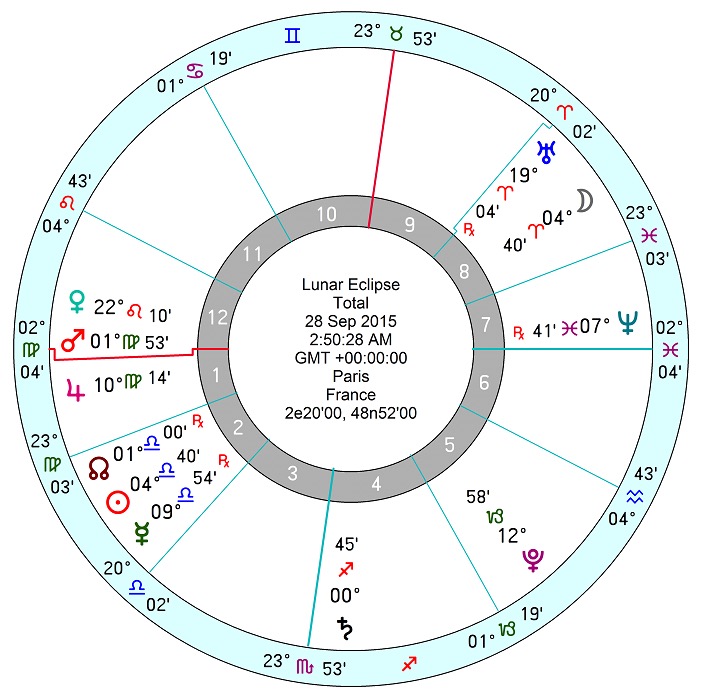 Hier einmal die astrologische Darstellung, bei der, in der jetzt nicht gezeigten *ACG* Darstellung, die Marslinie auffällig über Paris hinweggeht. Das bedeutet, daß auf Paris gerechnete Finsternishroskop hat am AS den Mars: