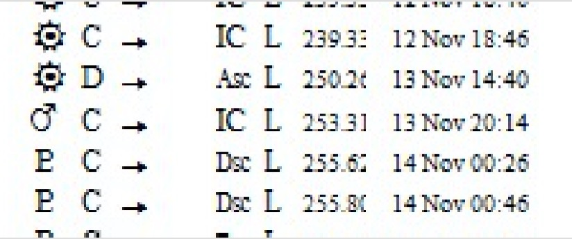 Wenn man bei dem Finsternishorskop (weil Mondfinsternis im lunaren Rhythmus) nun die Achsen Primär verschiebt kommt der Mars an das IC am 13. Nov. mit UT 20.14!
